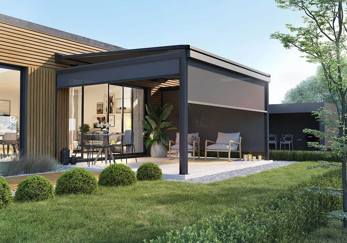 Vi tilbyr motoriserte hev/senk-vegger og LED-lys i taket av pergolaen som gjør uteområdet ditt mer komfortabelt og luksuriøst.